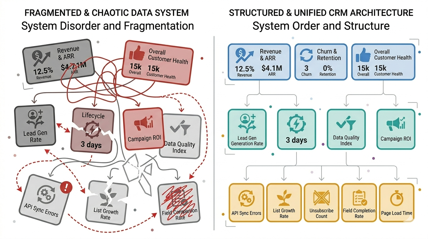 Data from the billing system contradicts data in HubSpot. Customer records in the support tool don't match the CRM. Integrations were installed as point solutions and never designed as a system. Data flows in one direction, gets stale, and creates a secondary source-of-truth problem.